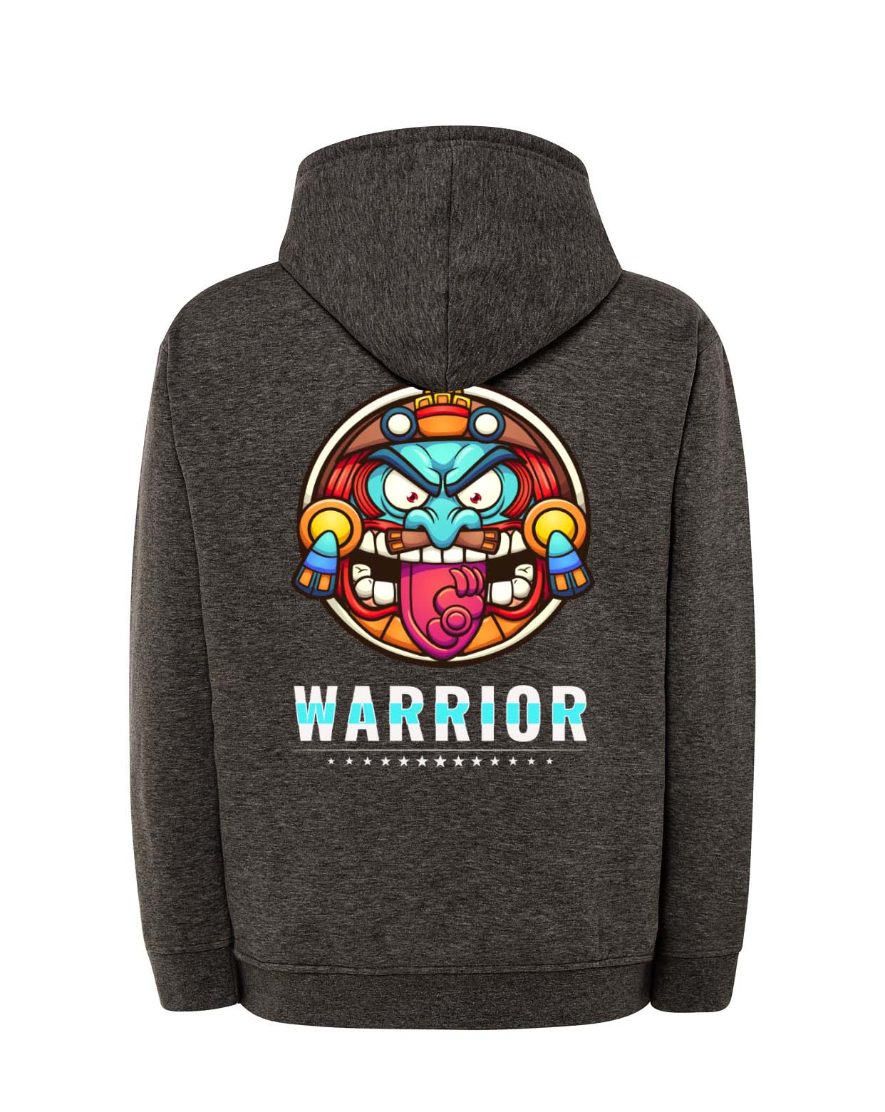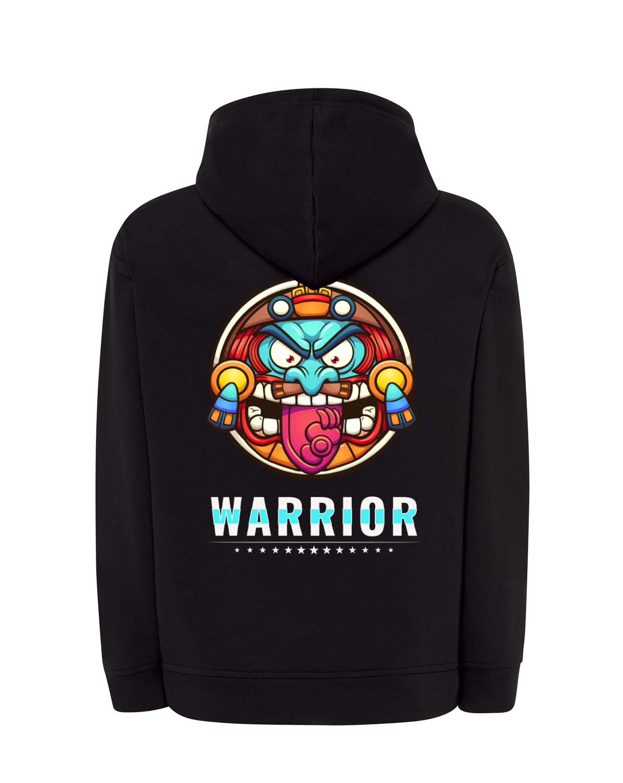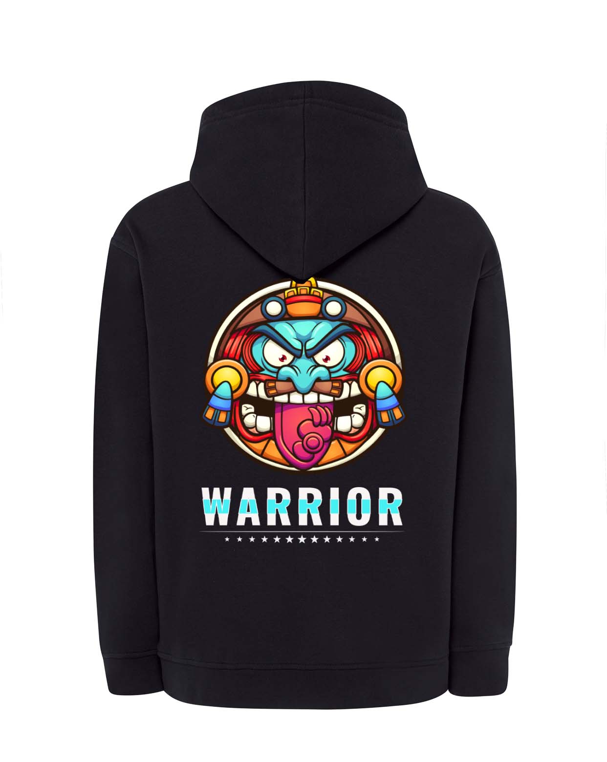Una prenda que transmite fuerza, energía y estilo. Esta sudadera con capucha en negro destaca por su diseño gráfico vibrante en la espalda: un rostro guerrero con colores intensos y mirada desafiante, acompañado del mensaje “WARRIOR” y una fila de estrellas. Perfecta para jóvenes que se sienten únicos, valientes y con actitud.